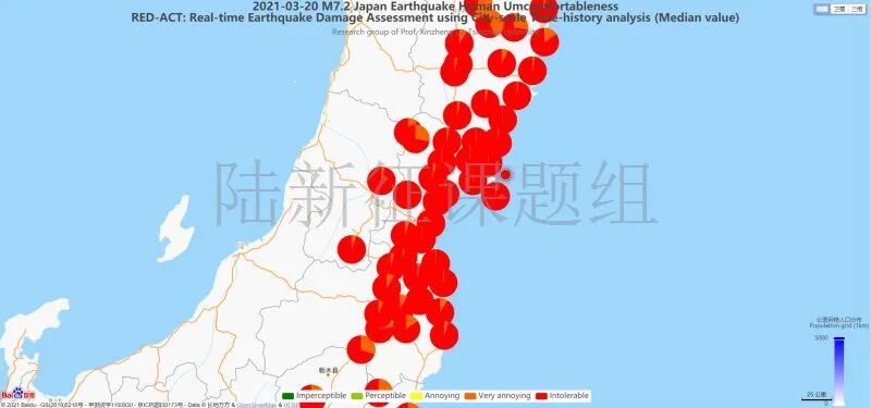 图5 20210320日本本州东岸近海7.2级地震不同台站地震记录人员加速度感受分布图