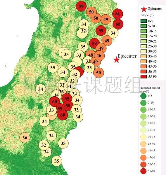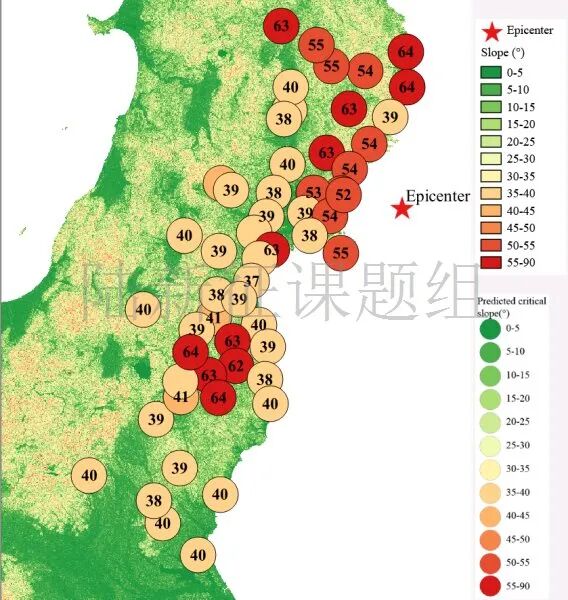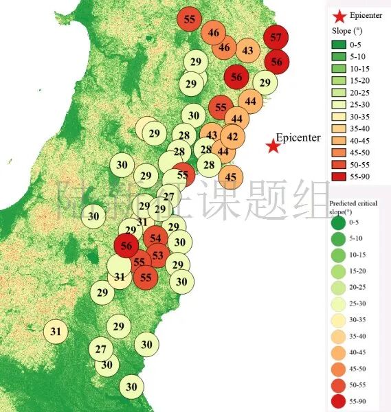 根据当地地形数据、岩性数据和实测地面运动记录,可以计算得到不同滑坡体饱和比例下的滑坡分布,如图6所示。其中,底图为当地坡度分布图,每个圆圈代表每个台站的计算结果,圆圈中的数字代表发生滑坡的临界坡度,台站附近坡度大于该数值的地方滑坡发生概率高。