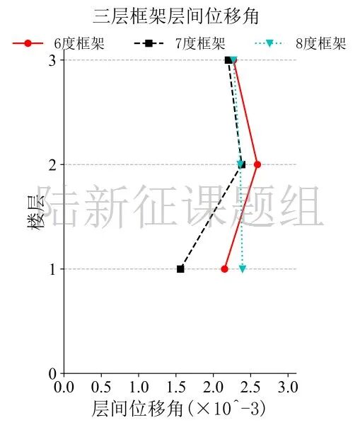 将典型台站记录输入立面布置如图7 (a)所示的6度、7度和8度设防的典型三层钢筋混凝土框架结构,得到其层间位移角包络如图7 (b)所示。