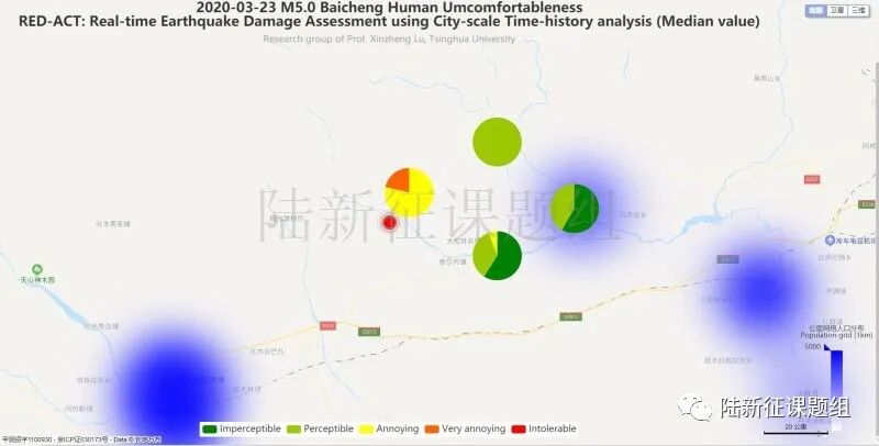利用密布强震台网在震后获取的实时地震动信息,再结合城市抗震弹塑性分析,就可以得到地震发生后不同地点的建筑破坏情况,为抗震救灾决策提供科学支撑。图3为根据20200323新疆阿克苏地区拜城县5.0级地震震中附近范围内台站记录分析得到的建筑震害分布示意图。图4为根据20200323新疆阿克苏地区拜城县5.0级地震震中附近范围内台站记录分析得到的人员加速度感受分布示意图。