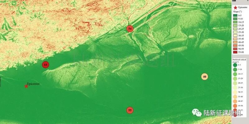 根据当地地形数据、岩性数据和实测地面运动记录,可以计算得到不同滑坡体饱和比例下的滑坡分布,如图5所示。其中,底图为当地坡度分布图,每个圆圈代表每个台站的计算结果,圆圈中的数字代表发生滑坡的临界坡度,台站附近坡度大于该数值的地方滑坡发生概率高。