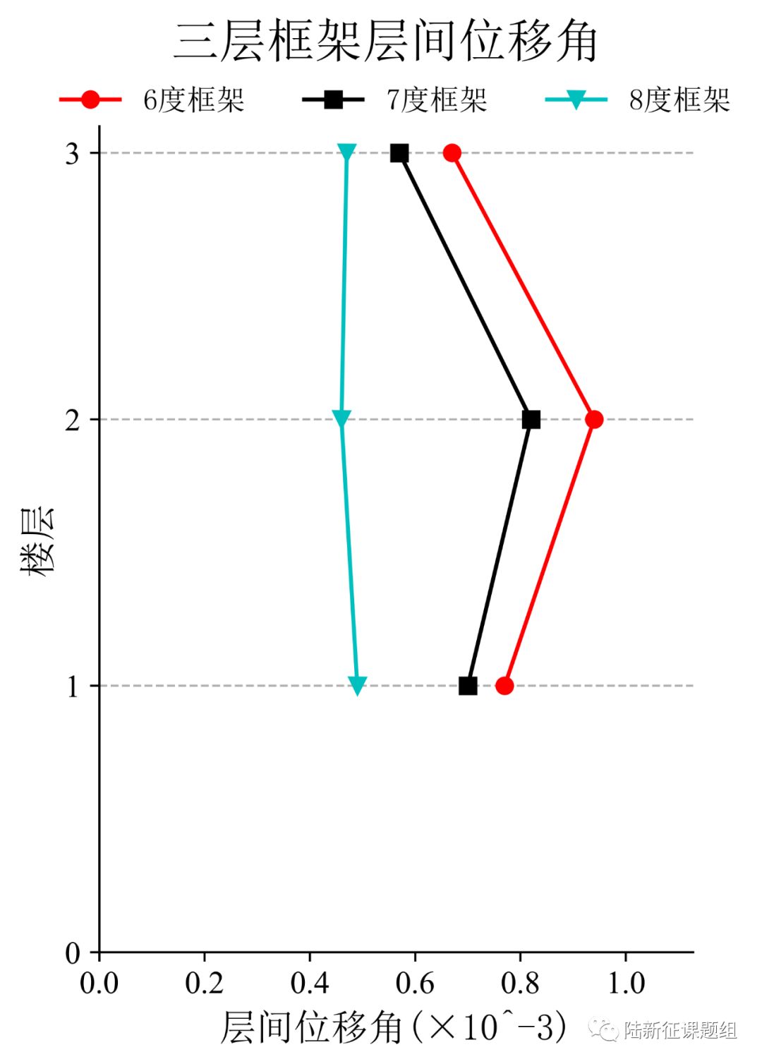 将65LHT台站记录输入立面布置如图6 (a)所示的6度、7度和8度设防的典型三层钢筋混凝土框架结构,得到其层间位移角包络如图6 (b)所示。