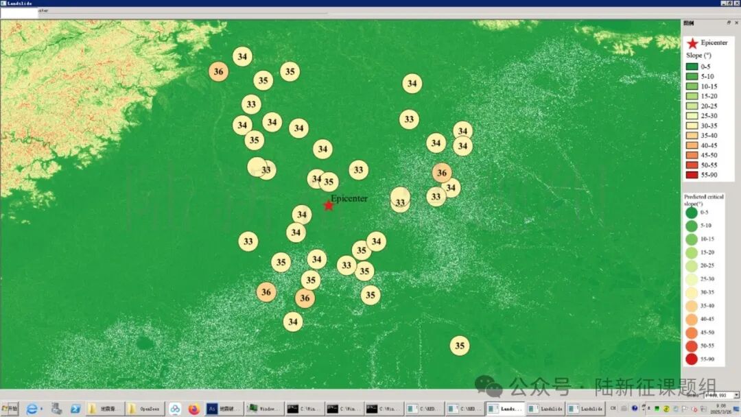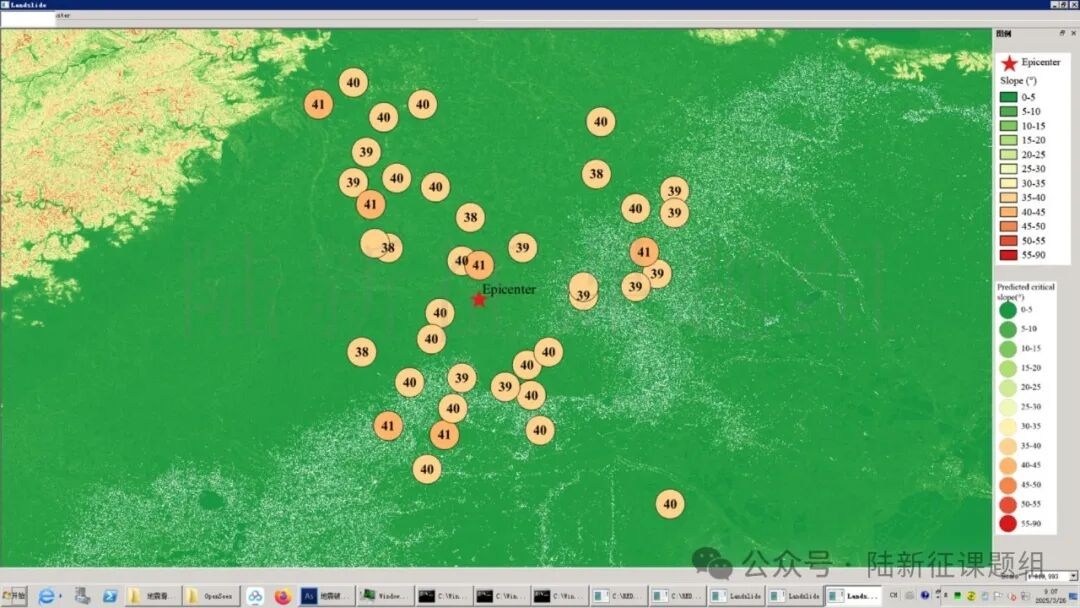 根据当地地形数据、岩性数据和实测地面运动记录,可以计算得到不同滑坡体饱和比例下的滑坡分布,如图5所示。其中,底图为当地坡度分布图,每个圆圈代表每个台站的计算结果,圆圈中的数字代表发生滑坡的临界坡度,台站附近坡度大于该数值的地方滑坡发生概率高。