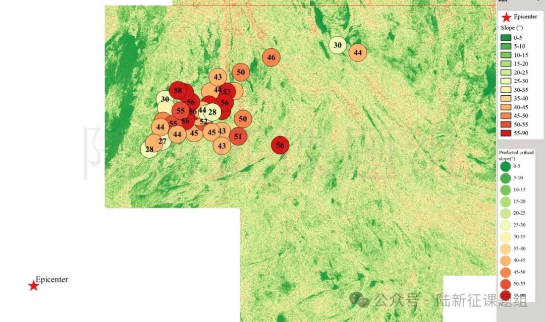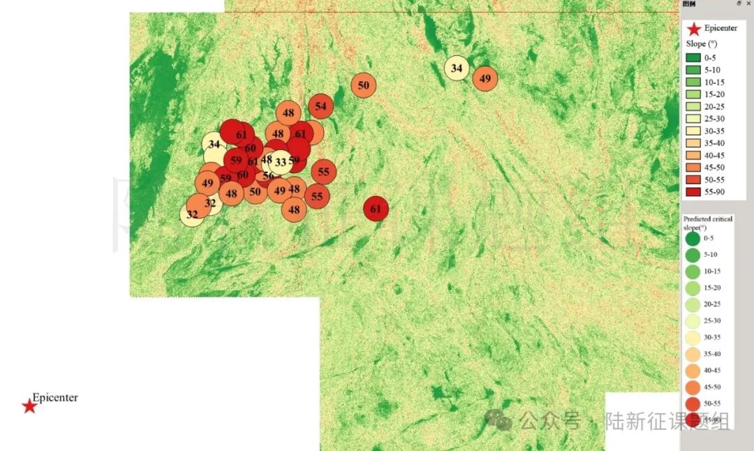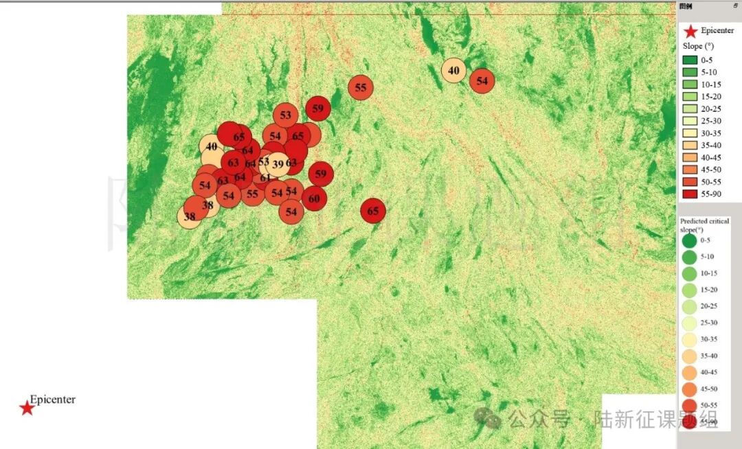 根据当地地形数据、岩性数据和实测地面运动记录,可以计算得到不同滑坡体饱和比例下的滑坡分布,如图5所示。其中,底图为当地坡度分布图,每个圆圈代表每个台站的计算结果,圆圈中的数字代表发生滑坡的临界坡度,台站附近坡度大于该数值的地方滑坡发生概率高。
