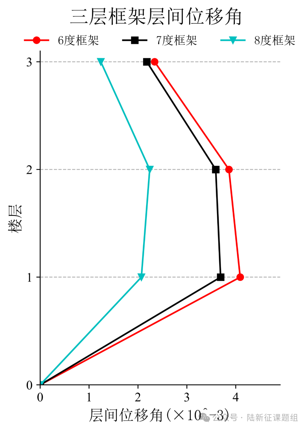 将典型台站记录输入立面布置如图6(a)所示的6度、7度和8度设防的典型三层钢筋混凝土框架结构,得到其层间位移角包络如图6(b)所示。