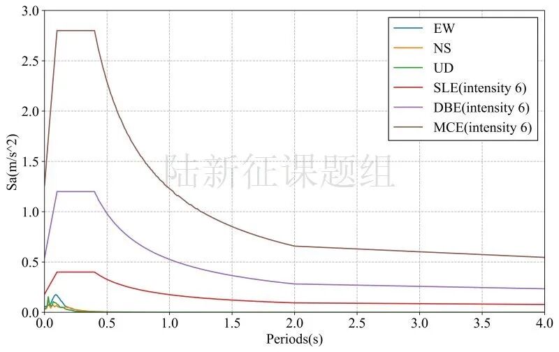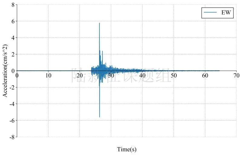 MCKCP记录台站位置北纬40.18度,东经116.21度(图1,其中红色标记为震中位置),记录到水平向地震动峰值加速度为5.8cm/s/s。该地震动及反应谱如图2、图3所示。