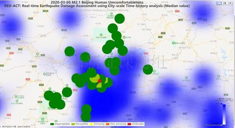利用密布强震台网在震后获取的实时地震动信息,再结合城市抗震弹塑性分析,就可以得到地震发生后不同地点的建筑破坏情况,为抗震救灾决策提供科学支撑。图4为根据20200305北京市昌平区2.1级地震震中附近范围内台站记录分析得到的建筑震害分布示意图。图5为根据20200305北京市昌平区2.1级地震震中附近范围内台站记录分析得到的人员加速度感受分布示意图。