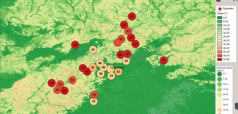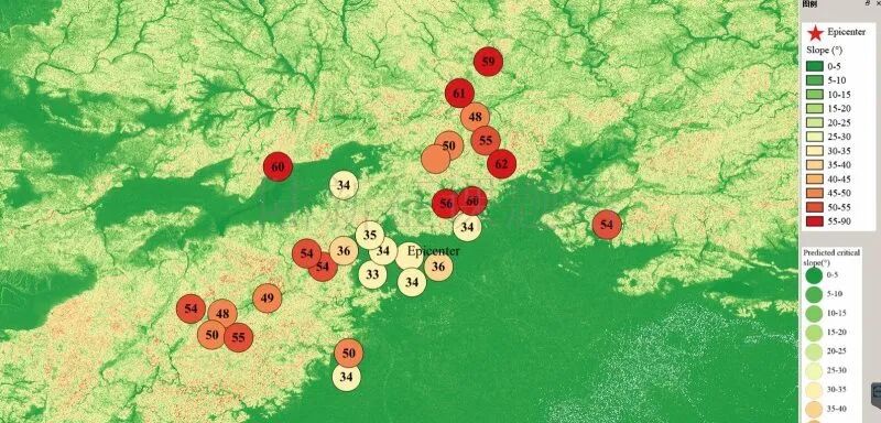 根据当地地形数据、岩性数据和实测地面运动记录,可以计算得到不同滑坡体饱和比例下的滑坡分布,如图6所示。其中,底图为当地坡度分布图,每个圆圈代表每个台站的计算结果,圆圈中的数字代表发生滑坡的临界坡度,台站附近坡度大于该数值的地方滑坡发生概率高。