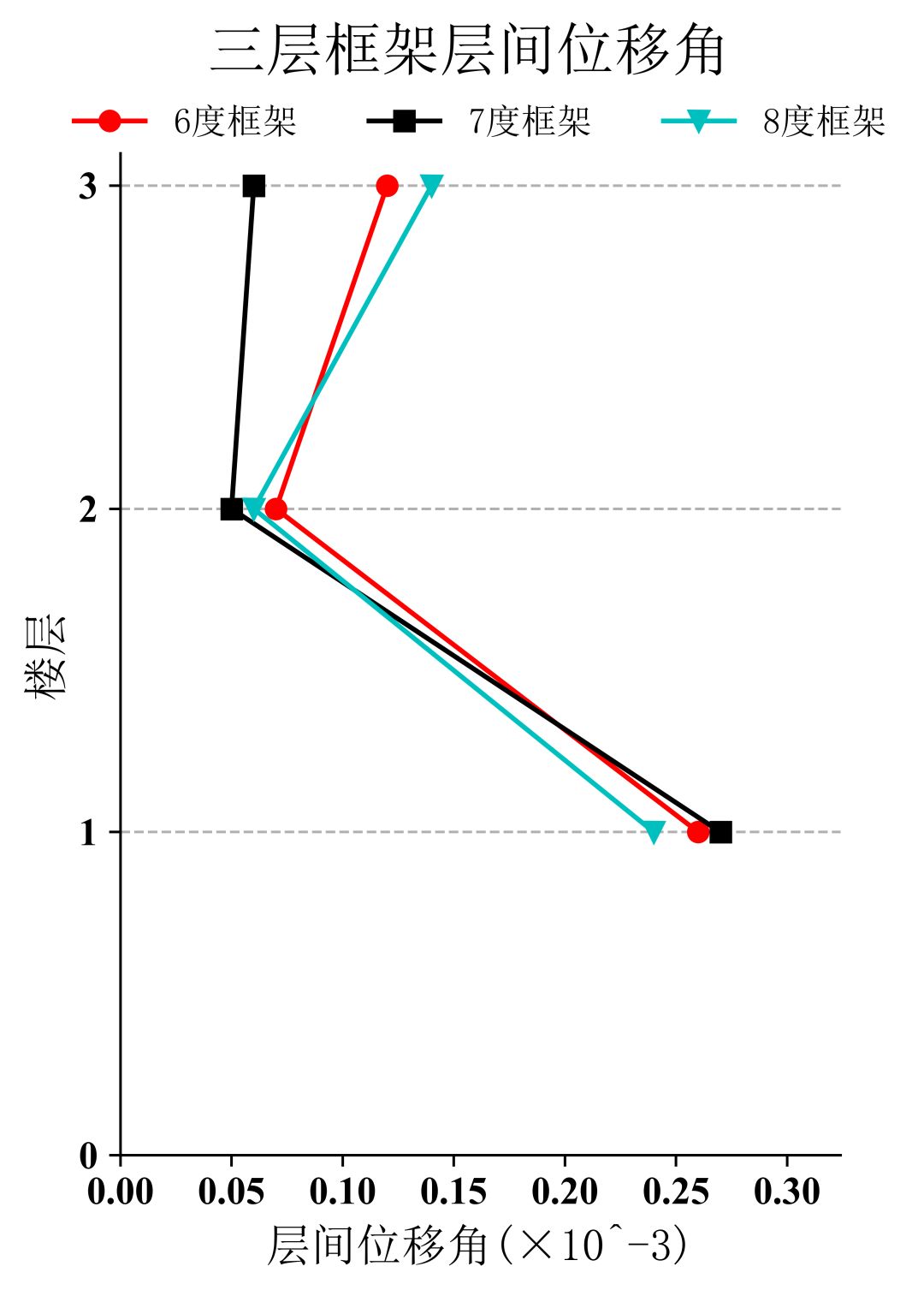 将MCKCP台站记录输入立面布置如图7 (a)所示的6度、7度和8度设防的典型三层钢筋混凝土框架结构,得到其层间位移角包络如图7 (b)所示。