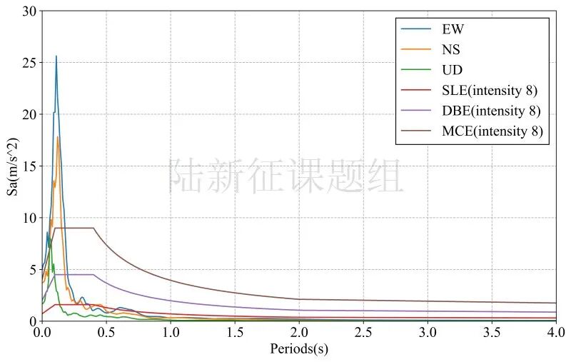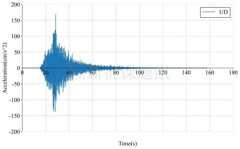 MYG002典型台站位置北纬38.7262度,东经141.511度(图1,其中红色标记为震中位置),记录到水平向地震动峰值加速度为546cm/s/s,竖直向地震动峰值加速度为169cm/s/s。该地震动及反应谱如图2、图3所示。