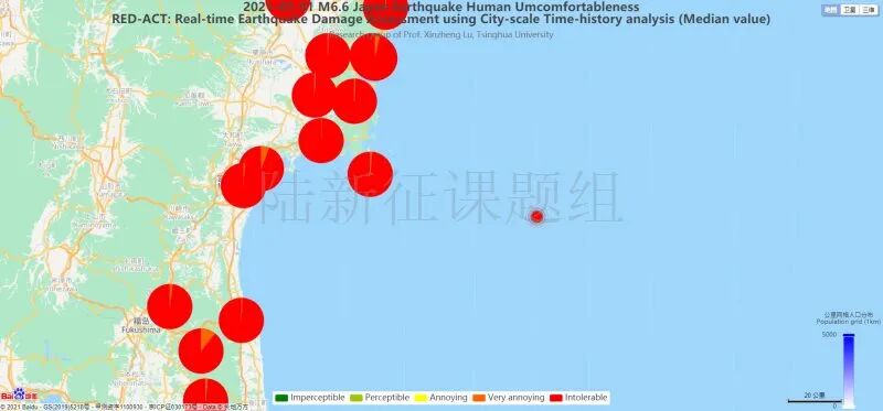 图5 20210501日本本州东岸近海6.6级地震不同台站地震记录人员加速度感受分布图