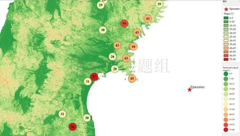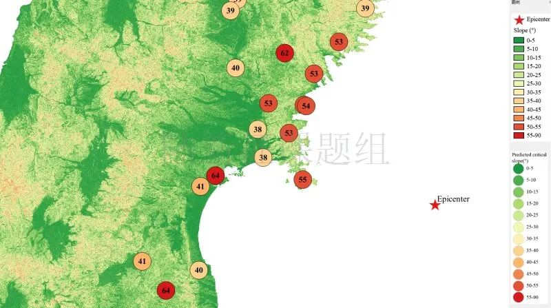 根据当地地形数据、岩性数据和实测地面运动记录,可以计算得到不同滑坡体饱和比例下的滑坡分布,如图6所示。其中,底图为当地坡度分布图,每个圆圈代表每个台站的计算结果,圆圈中的数字代表发生滑坡的临界坡度,台站附近坡度大于该数值的地方滑坡发生概率高。