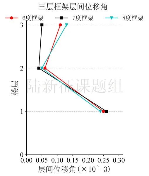 将典型台站记录输入立面布置如图7 (a)所示的6度、7度和8度设防的典型三层钢筋混凝土框架结构,得到其层间位移角包络如图7 (b)所示。