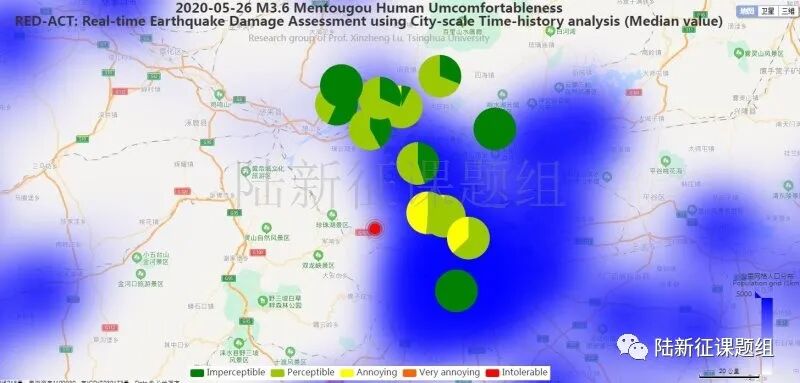 利用密布强震台网在震后获取的实时地震动信息,再结合城市抗震弹塑性分析,就可以得到地震发生后不同地点的建筑破坏情况,为抗震救灾决策提供科学支撑。图3为根据20200526北京门头沟区3.6级地震震中附近范围内台站记录分析得到的建筑震害分布示意图。图4为根据20200526北京门头沟区3.6级地震震中附近范围内台站记录分析得到的人员加速度感受分布示意图。
