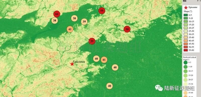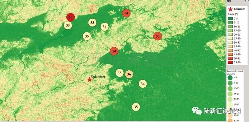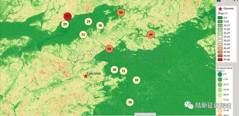 根据当地地形数据、岩性数据和实测地面运动记录,可以计算得到不同滑坡体饱和比例下的滑坡分布,如图5所示。其中,底图为当地坡度分布图,每个圆圈代表每个台站的计算结果,圆圈中的数字代表发生滑坡的临界坡度,台站附近坡度大于该数值的地方滑坡发生概率高。
