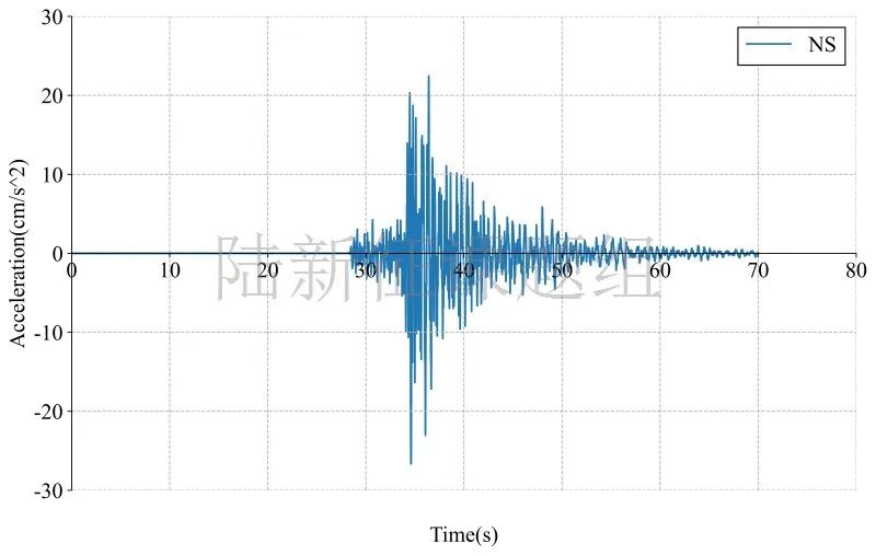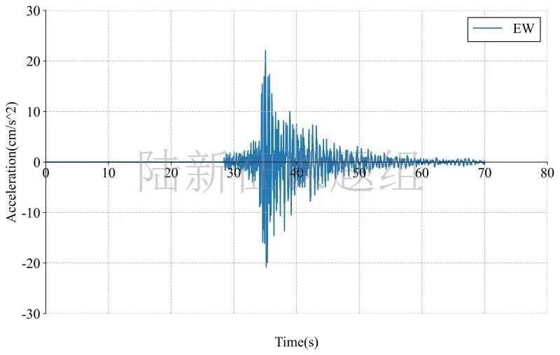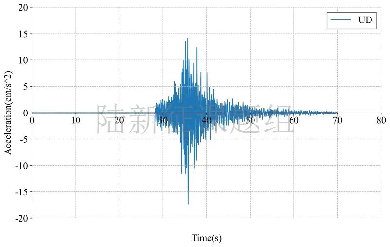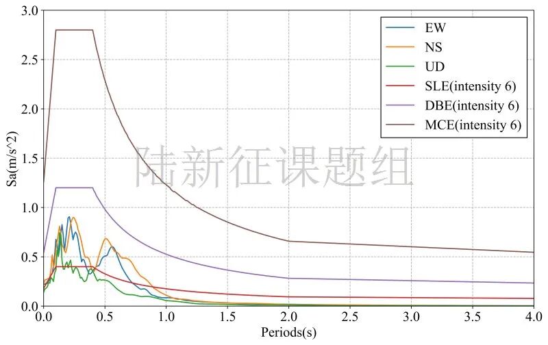 53YMX典型台站位置北纬24.67度,东经102.17度(图1,其中红色标记为震中位置),记录到水平向地震动峰值加速度为26.6cm/s/s,竖直向地震动峰值加速度为17.3cm/s/s。该地震动及反应谱如图2、图3所示。