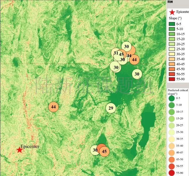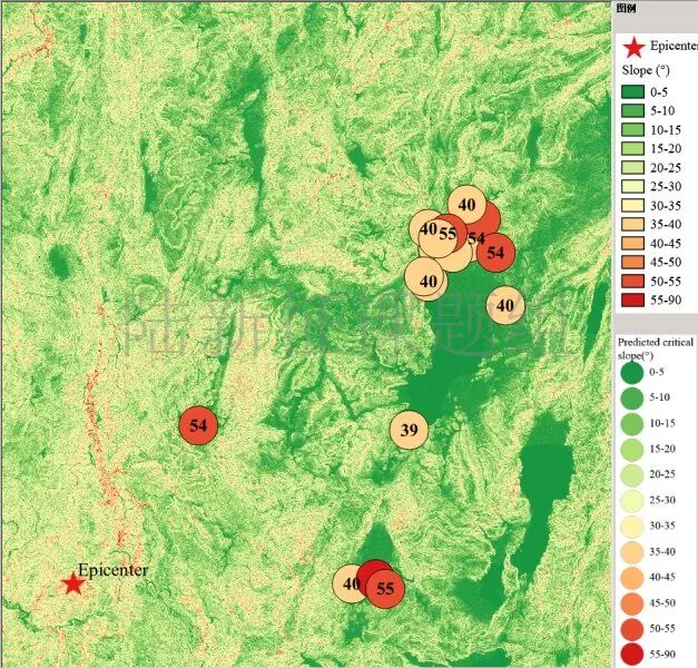 根据当地地形数据、岩性数据和实测地面运动记录,可以计算得到不同滑坡体饱和比例下的滑坡分布,如图6所示。其中,底图为当地坡度分布图,每个圆圈代表每个台站的计算结果,圆圈中的数字代表发生滑坡的临界坡度,台站附近坡度大于该数值的地方滑坡发生概率高。
