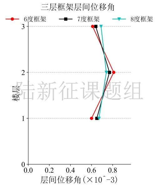 将典型台站记录输入立面布置如图7 (a)所示的6度、7度和8度设防的典型三层钢筋混凝土框架结构,得到其层间位移角包络如图7 (b)所示。