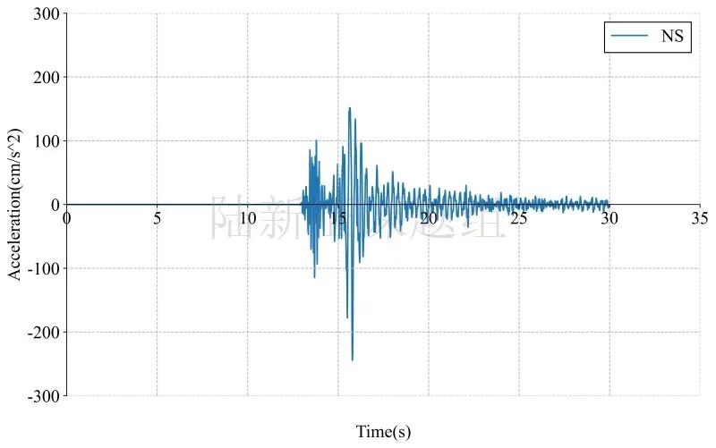 N2301典型台站位置北纬25.02度,东经97.82度(图1,其中红色标记为震中位置),记录到水平向地震动峰值加速度为244.35cm/s/s,竖直向地震动峰值加速度为135.42cm/s/s。该地震动及反应谱如图2、图3所示。