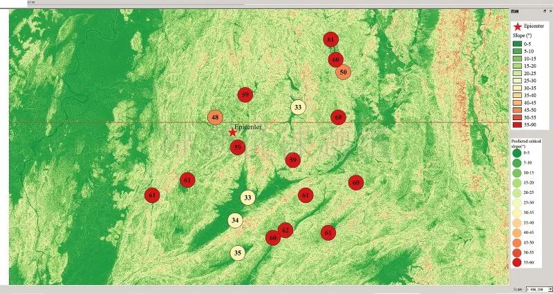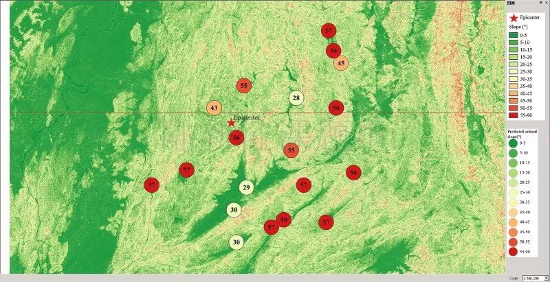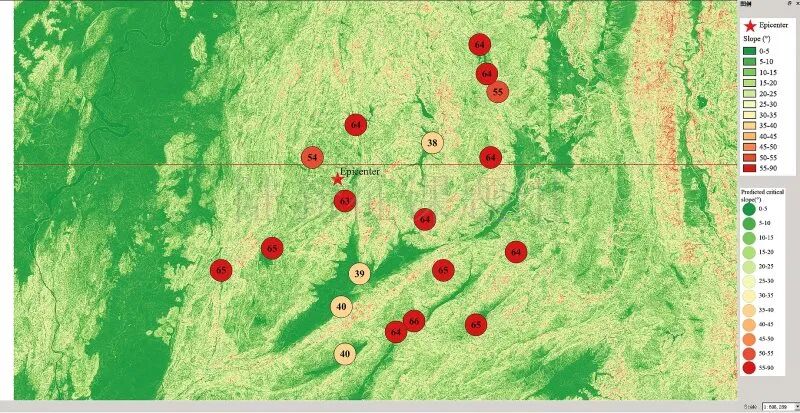 根据当地地形数据、岩性数据和实测地面运动记录,可以计算得到不同滑坡体饱和比例下的滑坡分布,如图6所示。其中,底图为当地坡度分布图,每个圆圈代表每个台站的计算结果,圆圈中的数字代表发生滑坡的临界坡度,台站附近坡度大于该数值的地方滑坡发生概率高。