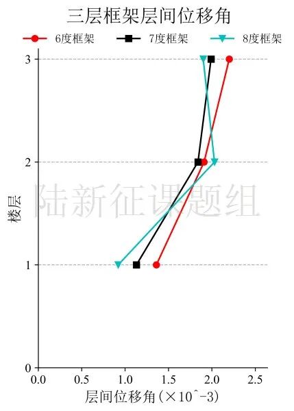 将典型台站记录输入立面布置如图7(a)所示的6度、7度和8度设防的典型三层钢筋混凝土框架结构,得到其层间位移角包络如图7(b)所示。