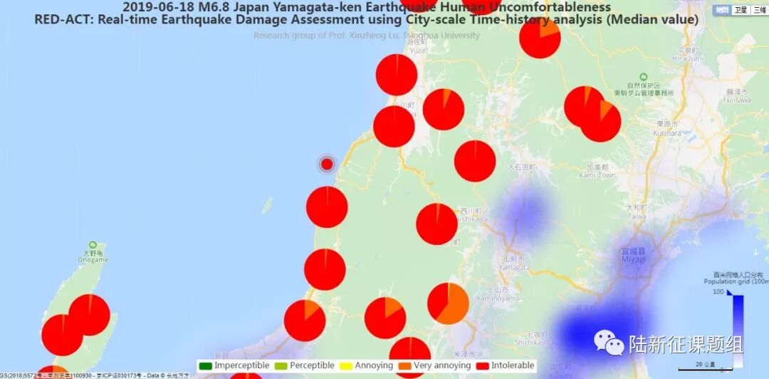 Using the real-time ground motions obtained from the strong motion networks and the city-scale nonlinear time-history analysis (see the Appendix of this report), the damage ratios of buildings located in different places can be obtained. The building damage distribution and the human uncomfortableness distribution near to different stations are shown in Figure 2 and Figure 3, respectively. These outcomes can provide a reference for post-earthquake rescue work.