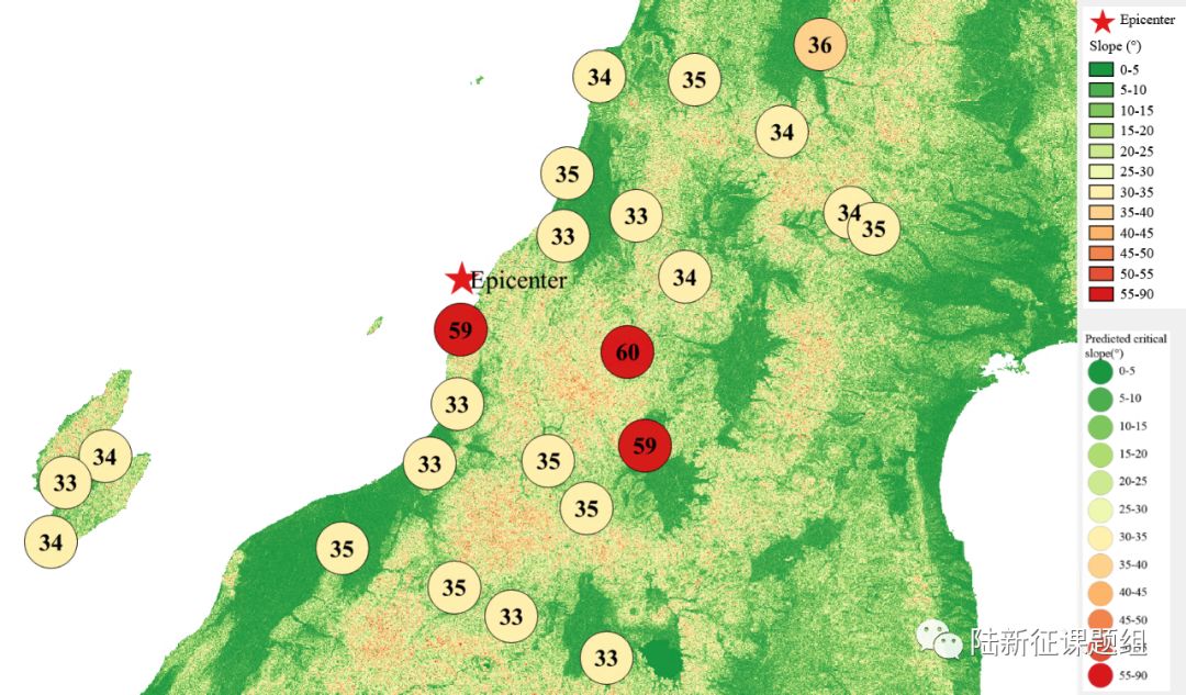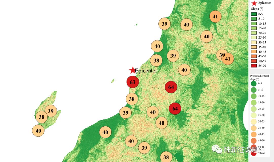 According to local topographic data, lithology data and ground motion records, the distribution of earthquake-induced landslide near to different stations under the different proportions of the landslide slab thickness that is saturated can be calculated, as shown in Figure 4. The basemap shows the distribution of the local slope. The number in the circle represents the critical slope of the landslide. The earthquake-induced landslide tends to occur with a higher probability when the slope near the station is larger than this threshold value.
