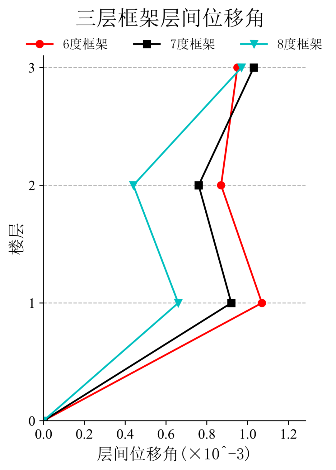 将典型台站记录输入立面布置如图6(a)所示的6度、7度和8度设防的典型三层钢筋混凝土框架结构,得到其层间位移角包络如图6(b)所示。