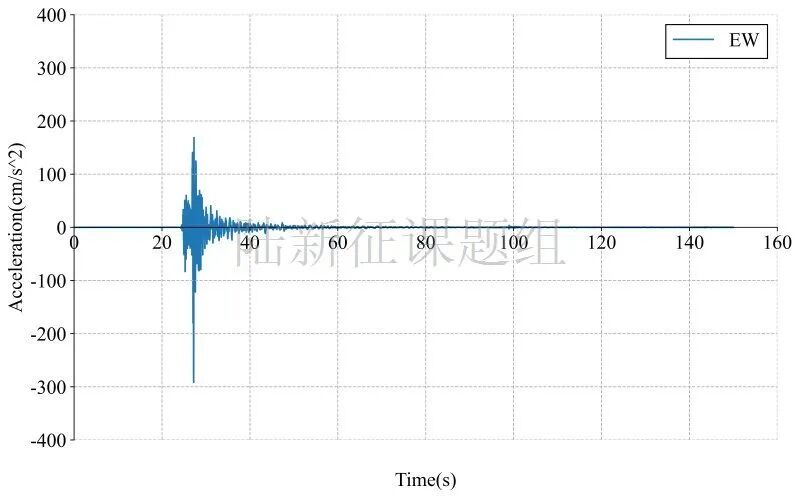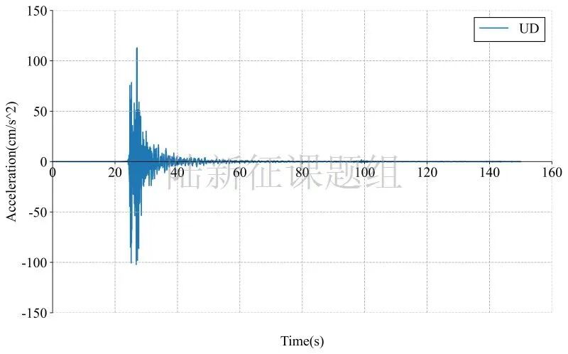 CICCC典型记录台站位置北纬35.525度,西经117.365度(图1,其中红色标记为震中位置),记录到水平向地震动峰值加速度为291.51cm/s/s,竖直向地震动峰值加速度为112.96cm/s/s。该地震动及反应谱如图2、图3所示。
