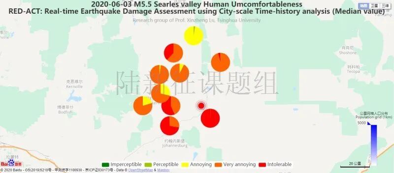 图5 20200604美国加州5.5级地震不同台站地震记录人员加速度感受分布图