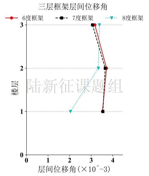 将典型台站记录输入立面布置如图6 (a)所示的6度、7度和8度设防的典型三层钢筋混凝土框架结构,得到其层间位移角包络如图6 (b)所示。
