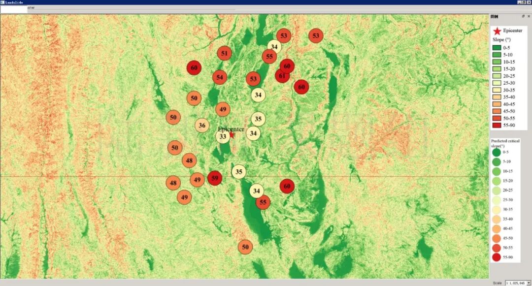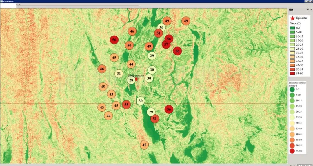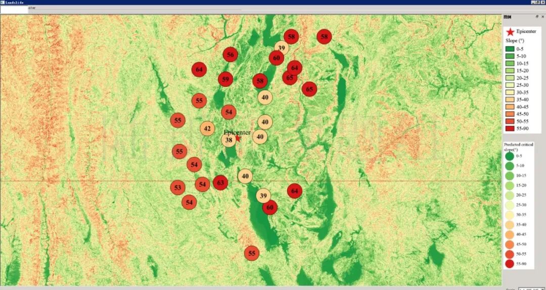 根据当地地形数据、岩性数据和实测地面运动记录,可以计算得到不同滑坡体饱和比例下的滑坡分布,如图5所示。其中,底图为当地坡度分布图,每个圆圈代表每个台站的计算结果,圆圈中的数字代表发生滑坡的临界坡度,台站附近坡度大于该数值的地方滑坡发生概率高。