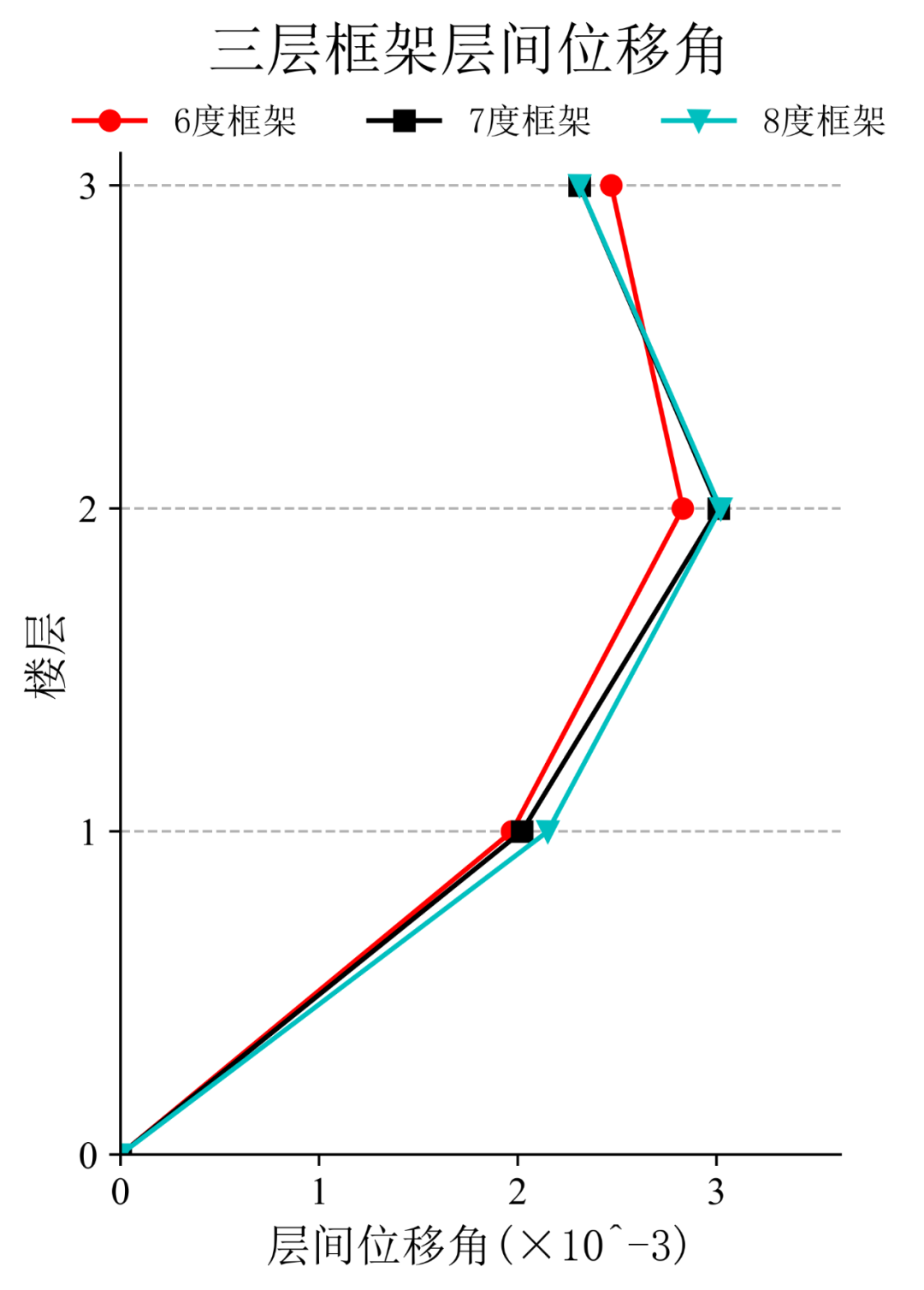 将典型台站记录输入立面布置如图6(a)所示的6度、7度和8度设防的典型三层钢筋混凝土框架结构,得到其层间位移角包络如图6(b)所示。