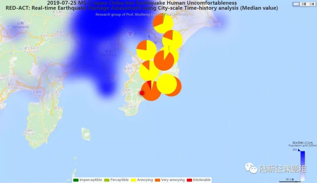Using the real-time ground motions obtained from the strong motion networks and the city-scale nonlinear time-history analysis, the damage ratios of buildings located in different places can be obtained. The building damage distribution and the human feeling distribution near to different stations are shown in Figure 2 and Figure 3, respectively. These outcomes can provide a reference for post-earthquake rescue work.