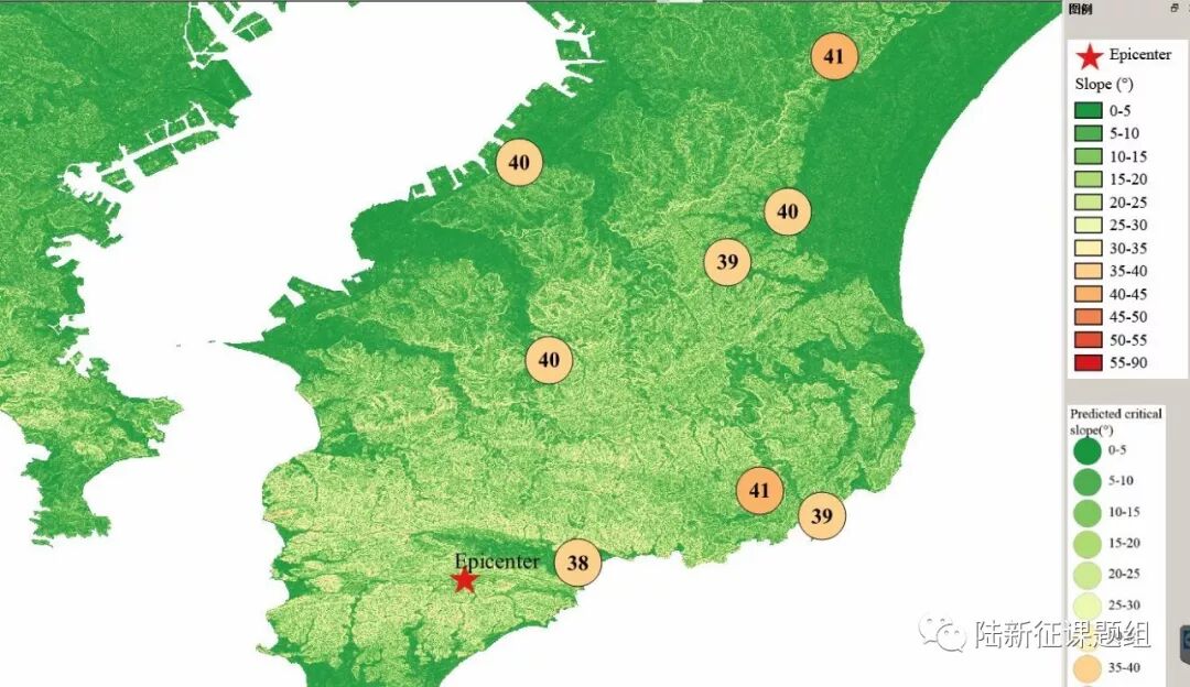 According to local topographic data, lithology data and ground motion records, the distribution of earthquake-induced landslide near to different stations under the different proportions of the landslide slab thickness that is saturated can be calculated, as shown in Figure 4. The basemap shows the distribution of the local slope. The number in the circle represents the critical slope of the landslide. The earthquake-induced landslide tends to occur with a higher probability when the slope near the station is larger than this threshold value.