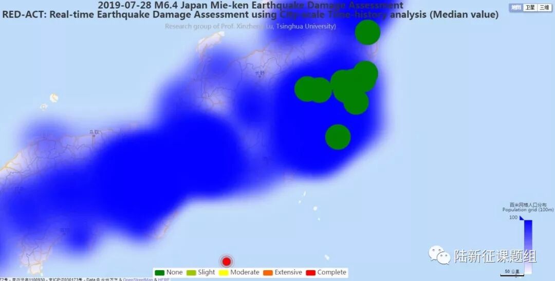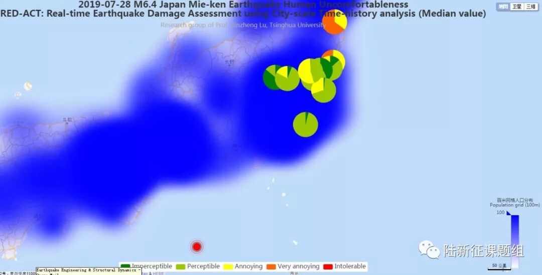 Using the real-time ground motions obtained from the strong motion networks and the city-scale nonlinear time-history analysis, the damage ratios of buildings located in different places can be obtained. The building damage distribution and the human feeling distribution near to different stations are shown in Figure 2 and Figure 3, respectively. These outcomes can provide a reference for post-earthquake rescue work.