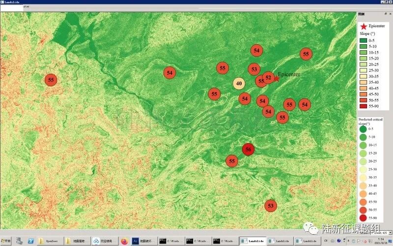 根据当地地形数据、岩性数据和实测地面运动记录,可以计算得到不同滑坡体饱和比例下的滑坡分布,如图5所示。其中,底图为当地坡度分布图,每个圆圈代表每个台站的计算结果,圆圈中的数字代表发生滑坡的临界坡度,台站附近坡度大于该数值的地方滑坡发生概率高。