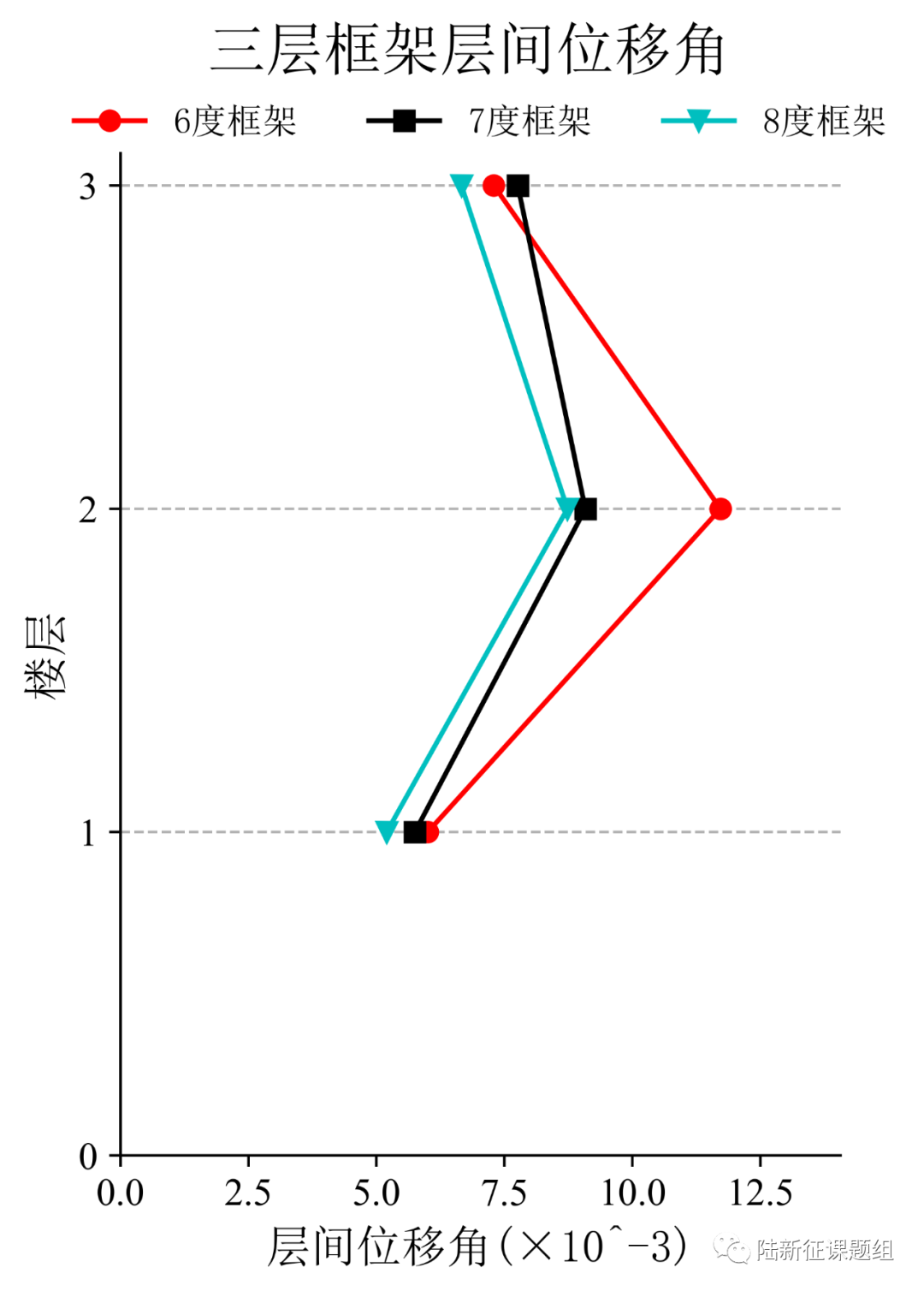 将典型台站记录SCK2803输入立面布置如图6 (a)所示的6度、7度和8度设防的典型三层钢筋混凝土框架结构,得到其层间位移角包络如图6 (b)所示。
