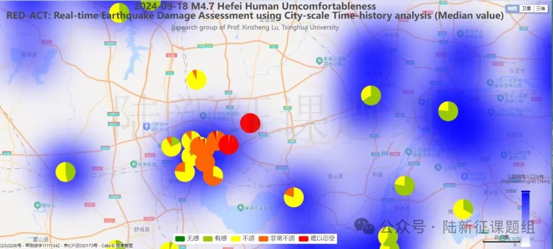 根据中国地震学会标准《基于强震动记录的地震破坏力评估T/SSC 1—2021》(参阅新标准发布 :基于强震动记录的地震破坏力评估),利用密布强震台网在震后获取的实时地震动信息,再结合城市抗震弹塑性分析,就可以得到地震发生后不同地点的建筑破坏情况,为抗震救灾决策提供科学支撑。图3为根据本次地震震中附近范围内台站记录分析得到的建筑震害分布示意图。图4为根据本次地震震中附近范围内台站记录分析得到的人员加速度感受分布示意图。