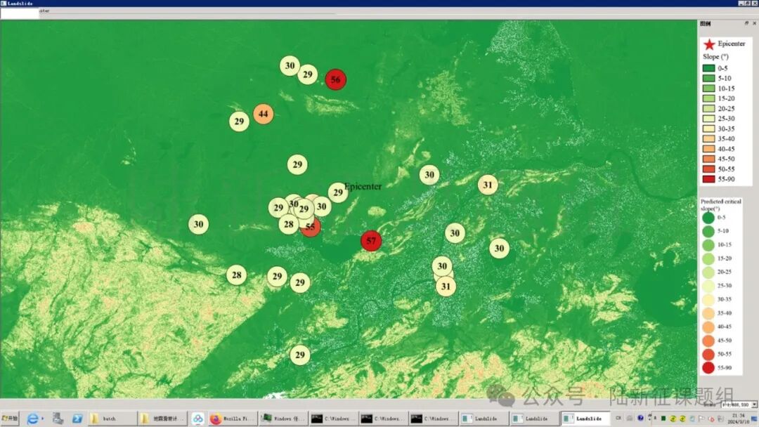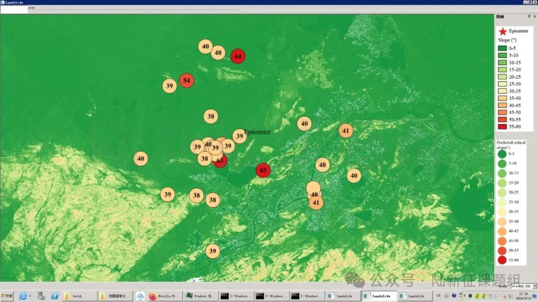 根据当地地形数据、岩性数据和实测地面运动记录,可以计算得到不同滑坡体饱和比例下的滑坡分布,如图5所示。其中,底图为当地坡度分布图,每个圆圈代表每个台站的计算结果,圆圈中的数字代表发生滑坡的临界坡度,台站附近坡度大于该数值的地方滑坡发生概率高。