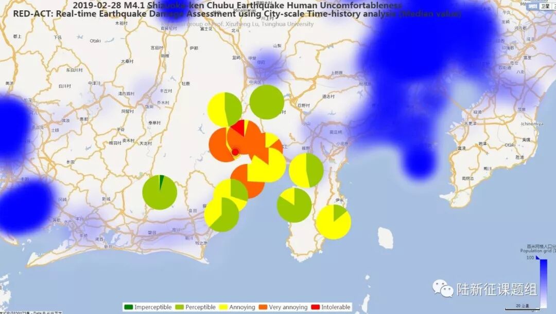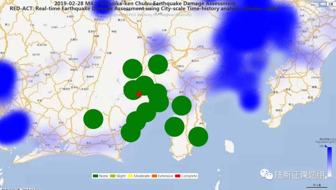 Using the real-time ground motions obtained from the strong motion networks and the city-scale nonlinear time-history analysis (see the Appendix of this report), the damage ratios of buildings located in different places can be obtained. The building damage distribution and the human uncomfortableness distribution near to different stations is shown in Figure 2 and Figure 3, respectively. These outcomes can provide a reference for post-earthquake rescue work.