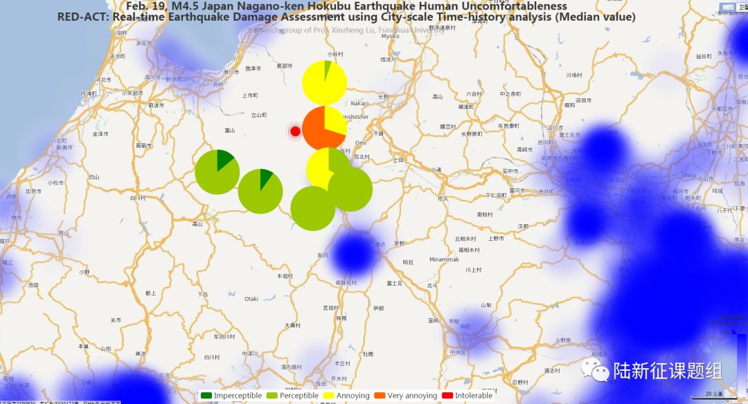 Using the real-time ground motions obtained from the strong motion networks and the city-scale nonlinear time-history analysis (see the Appendix of this report), the damage ratios of buildings located in different places can be obtained. The building damage distribution and the human uncomfortableness distribution near to different stations is shown in Figure 2 and Figure 3, respectively. These outcomes can provide a reference for post-earthquake rescue work.