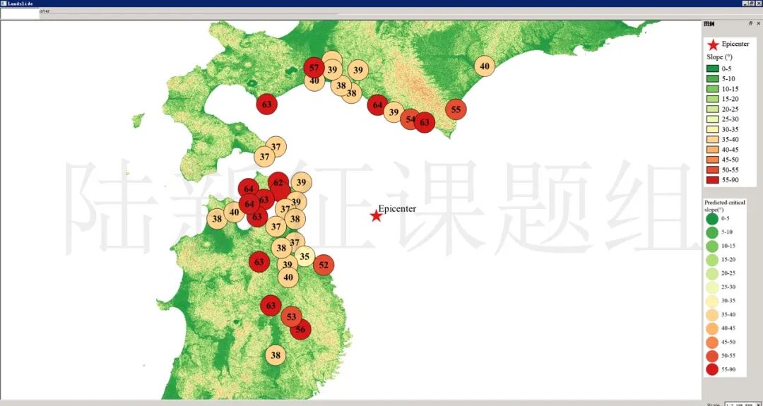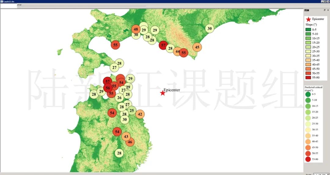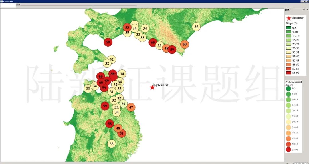 根据当地地形数据、岩性数据和实测地面运动记录,可以计算得到不同滑坡体饱和比例下的滑坡分布,如图5所示。其中,底图为当地坡度分布图,每个圆圈代表每个台站的计算结果,圆圈中的数字代表发生滑坡的临界坡度,台站附近坡度大于该数值的地方滑坡发生概率高。