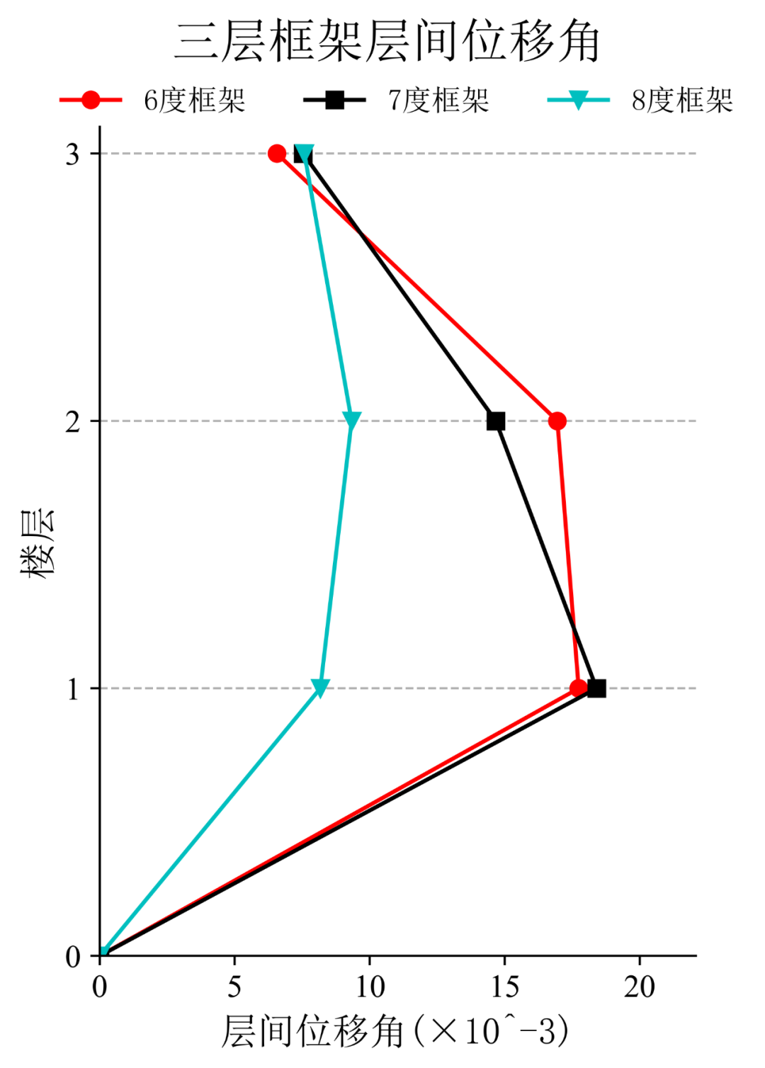 将典型台站记录输入立面布置如图6(a)所示的6度、7度和8度设防的典型三层钢筋混凝土框架结构,得到其层间位移角包络如图6(b)所示。
