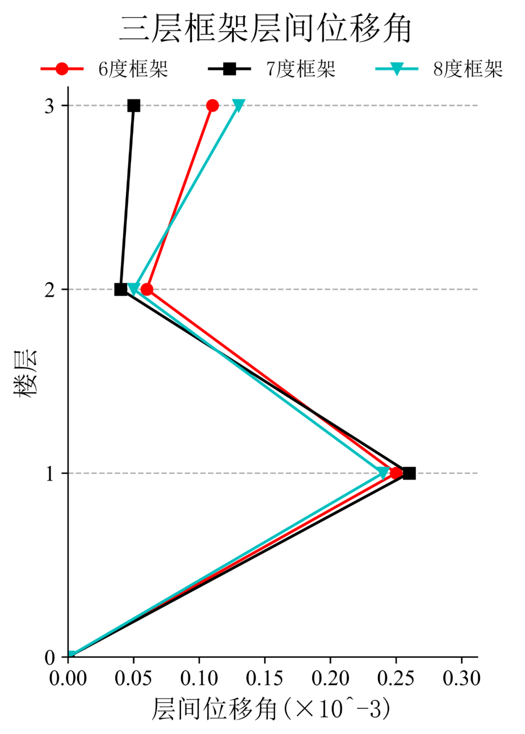 将典型台站记录输入立面布置如图4(a)所示的6度、7度和8度设防的典型三层钢筋混凝土框架结构,得到其层间位移角包络如图4(b)所示。