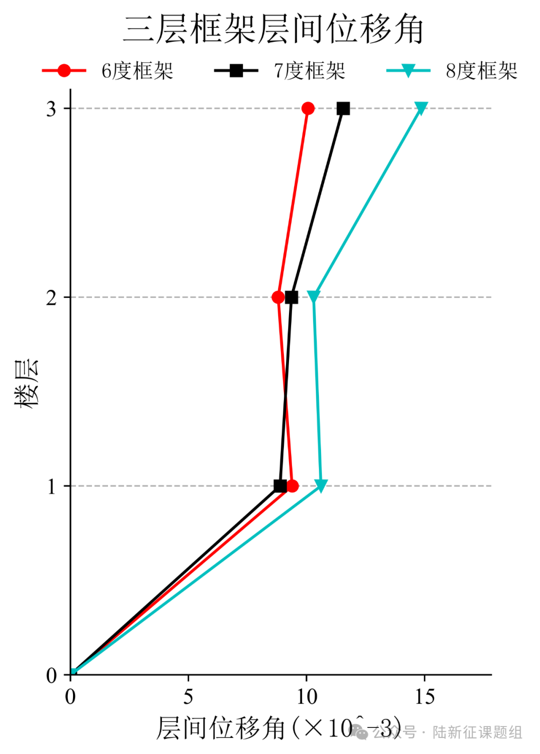 将典型台站记录输入立面布置如图3(a)所示的6度、7度和8度设防的典型三层钢筋混凝土框架结构,得到其层间位移角包络如图3(b)所示。
