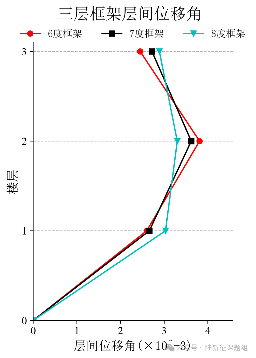 将典型台站记录输入立面布置如图3(a)所示的6度、7度和8度设防的典型三层钢筋混凝土框架结构,得到其层间位移角包络如图3(b)所示。