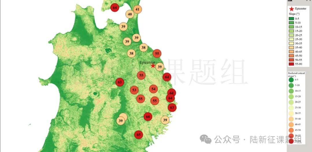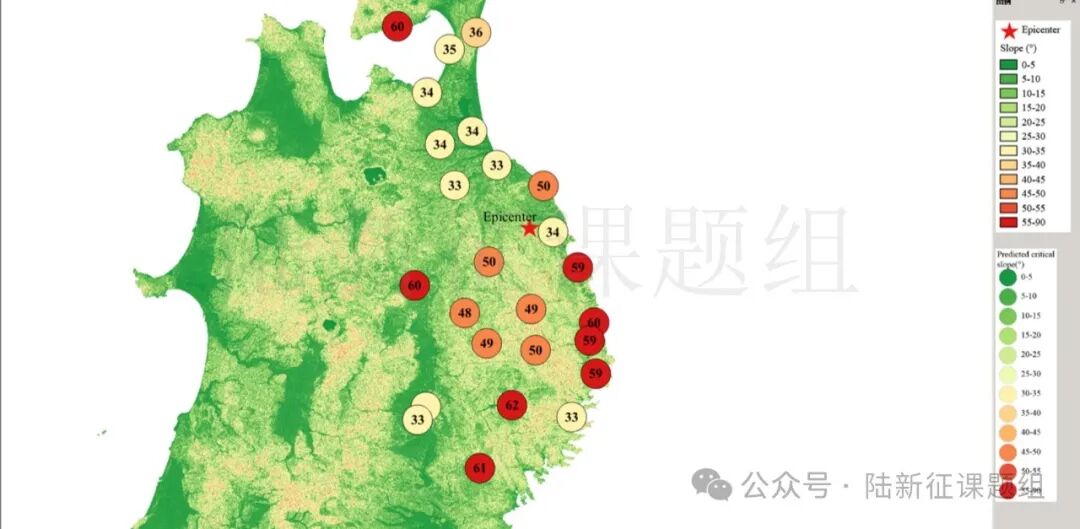 根据当地地形数据、岩性数据和实测地面运动记录,可以计算得到不同滑坡体饱和比例下的滑坡分布,如图5所示。其中,底图为当地坡度分布图,每个圆圈代表每个台站的计算结果,圆圈中的数字代表发生滑坡的临界坡度,台站附近坡度大于该数值的地方滑坡发生概率高。