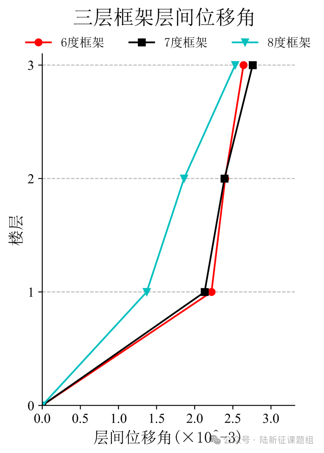 将典型台站记录输入立面布置如图6(a)所示的6度、7度和8度设防的典型三层钢筋混凝土框架结构,得到其层间位移角包络如图6(b)所示。