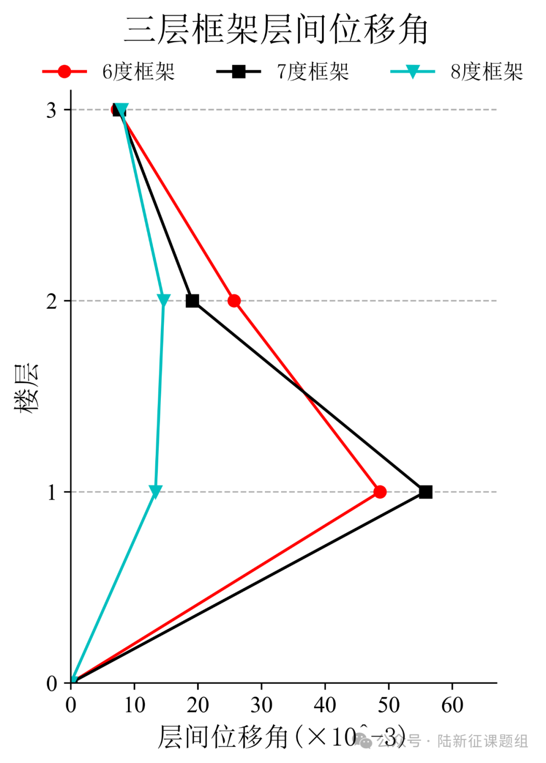 将典型台站记录输入立面布置如图3(a)所示的6度、7度和8度设防的典型三层钢筋混凝土框架结构,得到其层间位移角包络如图3(b)所示。